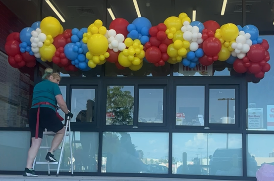 - Grand opening magic in full color! 🎉✨ This bold red, yellow, blue, and white organic balloon garland brought instant excitement and curb appeal to the storefront entrance.