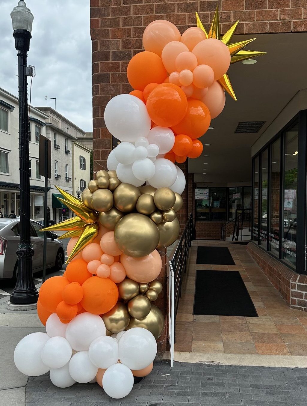 - Bold, bright, and impossible to miss ✨ This organic balloon garland brings gorgeous pops of orange, white, and gold to a storefront entrance in St. Louis