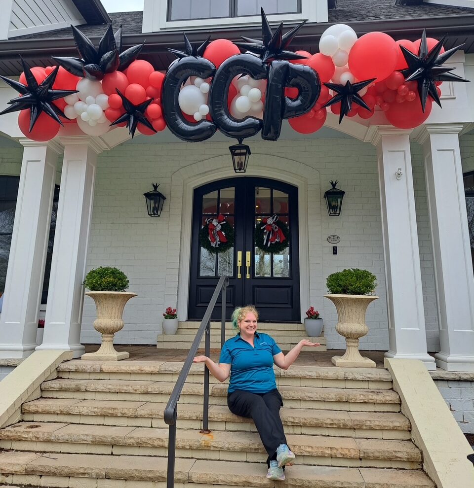 - A bold welcome ✨ This red, white, and black organic balloon garland — complete with custom CCP letters and dramatic black starburst foils — turned the front entrance into an unforgettable celebration moment.